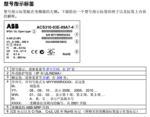 ABB變頻器ACS310型號標(biāo)簽: