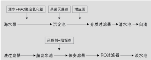 理文水廠海水淡化的工藝是這樣的:取得海水后,在水中加湮水與PAC 聚合氯化鋁后,到沉淀池,經(jīng)過沉淀后的河水到沙濾水池,經(jīng)過沙濾后的河水到清水池,經(jīng)過超濾進水泵,到自清洗過濾器,后進入超濾水池,超濾水池的水經(jīng)過 RO 出水泵,并加還原劑和阻垢劑后,經(jīng)過保安過濾器和 RO 過濾器流入淡水池,后經(jīng)過泵到達車間。簡單工藝示意圖如下所示: