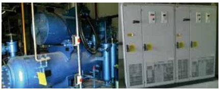 需要改造的設(shè)備為兩臺(tái)螺桿式制冷壓縮機(jī),其中一臺(tái)壓縮機(jī)的制冷量為11800kW,配套電機(jī)為ABB變頻電機(jī)QABP355M2A,電機(jī)額定功率250kW,電機(jī)額定電流463A,電機(jī)額定轉(zhuǎn)速2980r/min,電機(jī)調(diào)速范圍290-3880r/min;另一臺(tái)壓縮機(jī)的制冷量為578kW,配套電機(jī)為ABB變頻電機(jī)QABP315M2A,電機(jī)額定功率132kW,電機(jī)額定電流234A,電機(jī)額定轉(zhuǎn)速2980r/min,電機(jī)調(diào)速范圍290-4170r/min。