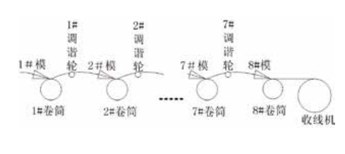 以8聯(lián)直線調(diào)諧式拉絲機(jī)為例,其工藝流程如圖1所示,主要由1個放線機(jī)、8個卷筒和一個收線機(jī)組成,絲料經(jīng)過1#拉絲模后卷繞在1#卷筒上,再依次經(jīng)2#8#拉絲模及卷筒,后由收線機(jī)將絲料卷繞在工字輪上,在每兩個卷筒之間設(shè)有調(diào)諧輪,用于調(diào)整絲料張力。