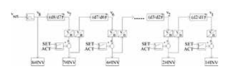 我們采用如圖3所示的控制方式。車速設(shè)定經(jīng)過總的積分曲線后給出,各傳動點線速度給定采用級聯(lián)結(jié)構(gòu)(速度鏈),以調(diào)諧輪位置調(diào)節(jié)器輸出與該點線速度設(shè)定值疊加后的量作為速度鏈下一級的輸入信號,即以本點變頻器的速度指令作為速度鏈下一級的輸入,圖中前后級間的速度關(guān)系也變?yōu)椋?/span>