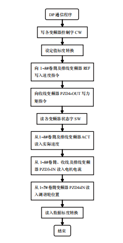 DP通信程序如圖5所示,DP通信采用周期通信方式,選 用PPO(Parameter/Process Data Objects)類型4,PLC通 過PPO周期性地向各臺變頻器寫控制字(CW)、給定值(REF),讀狀態(tài)字(SW)、實際值(ACT)和過程數(shù)據(jù)PZD3、PZD4。波特率采用1.5Mbit/s,1~8#卷筒變頻器通信相關(guān)參數(shù)設(shè)置為:參數(shù)5106=0104(設(shè)置PZD3-IN,將其用于傳送電機(jī)電流信號給PLC),參數(shù)5108=0120(設(shè)置PZD4-IN,將其用于傳送AI1端子信號給PLC,調(diào)諧輪位移傳感器信號接AI1端子),收線變頻器通信相關(guān)參數(shù)設(shè)置為:參數(shù)5107=3(設(shè)置PZD4-OUT,將其用于PLC向變頻器傳送力矩指令)。