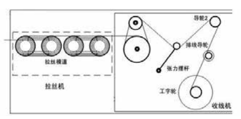 水箱式拉絲機(jī)的各個(gè)拉拔頭的工作速度就是基于以上的公式,保證各個(gè)拉拔頭同步運(yùn)行。由于水箱式拉絲機(jī)的拉絲過程完全通過機(jī)械軸拉拔完成,并且這些機(jī)械軸是在同一主軸下傳動(dòng)的,因此整個(gè)拉伸系統(tǒng)各級之間依靠拉伸輪的轉(zhuǎn)速差別和線上張力來控制同步協(xié)調(diào)工作。