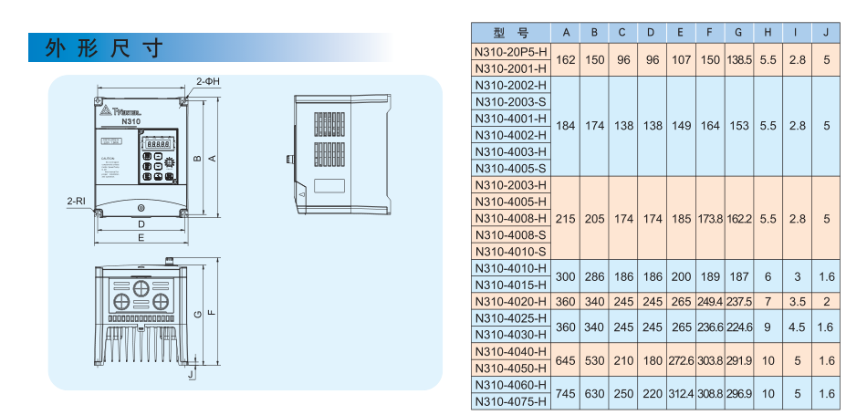 東元變頻器N310外形安裝尺寸數(shù)據(jù)圖: